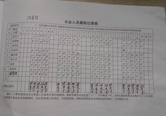 加强食堂工作人员管理,提高从业人员食品安全意识。所有食堂工作人员必须经过健康卫生检查并持有健康证方可上岗。落实晨检制度,建立从业人员健康档案。