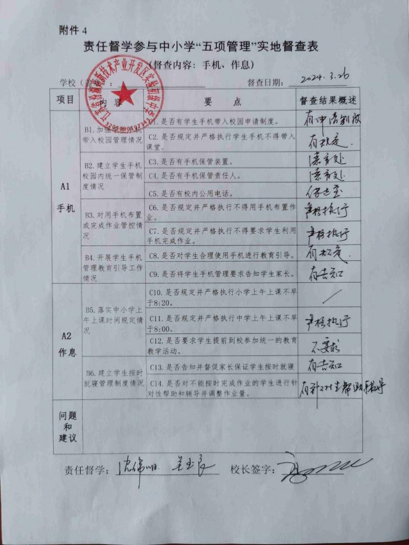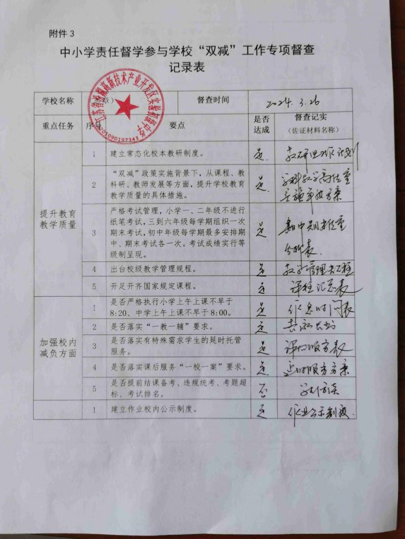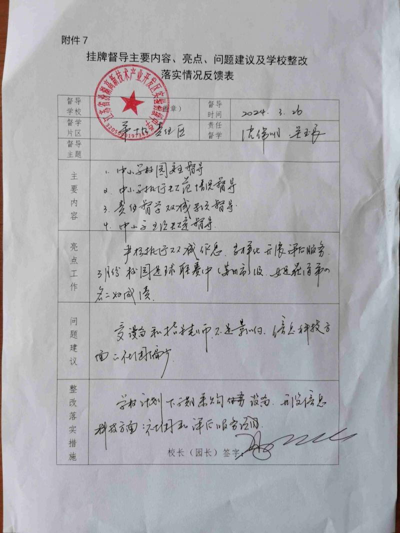 为深入贯彻落实“双减”政策,减轻学生负担,营造健康校园,区督察组领导莅临我校,就双减工作,整改工作,食品安全管理以及五项管理等方面进行督查。听取了来自德育处,教务处,总务处三位主任的汇报,对我校取得的成效给予高度评价,同时提出了管理层要加强双减工作的执行力,真正为学生着想。接着又检查了食堂,参观了学生的体育活动。要求我校把食品安全纳入学校重点工作任务,多开设一些信息科技方面的社团,让学生全面发展。