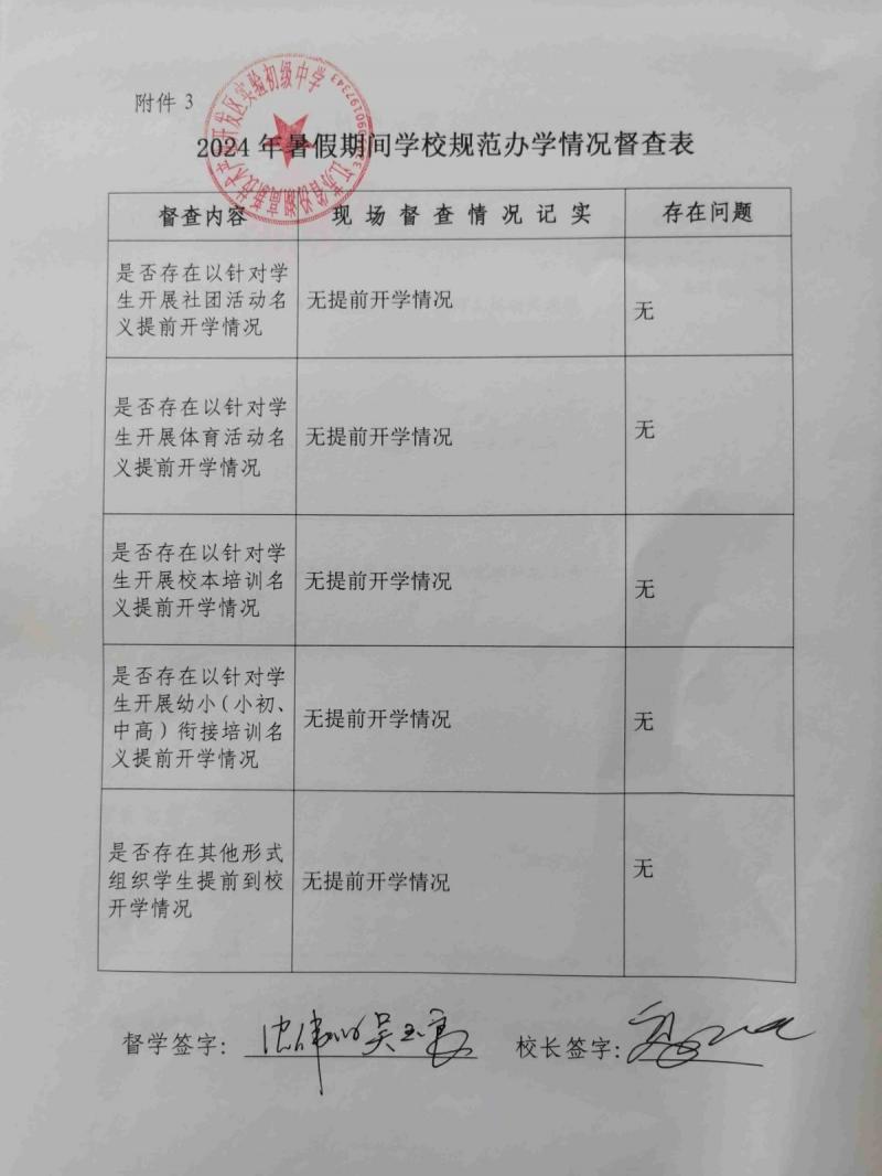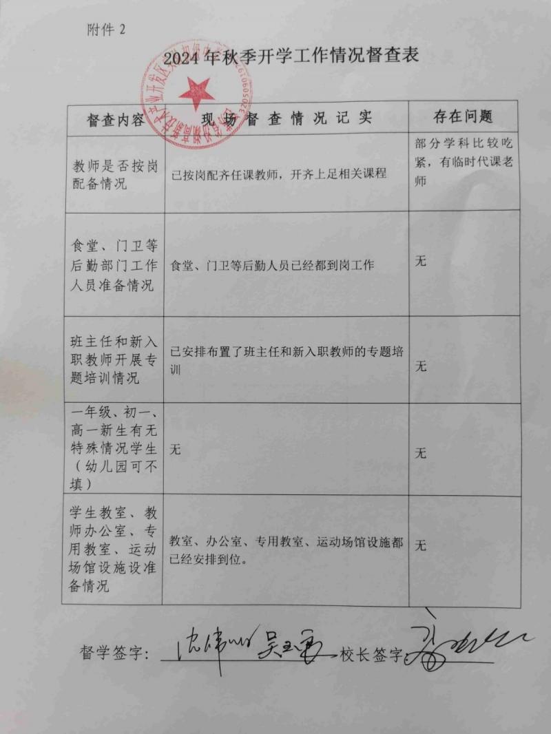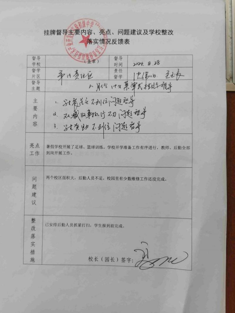 9月秋季开学在即,为确保校园和谐安全,顺利迎接全体师生返校,督察组特地来我校就开学准备工作,学校整改工作以及暑假规范办学情况等进行督查。领导们冒着酷热实地查看了教室,食堂,操场,实验室等地,围绕开学准备情况,对硬件设施进行了仔细检查,并对教师队伍,后勤人员配备,班主任队伍等工作进行督查。对校园陪餐不规范,双减政策不显著,学生资助不到位等问题也进行了督查。强调,一方面,学校要始终把安全工作放在首位;另一方面,要不断做强自己,不管提升学生的综合素养和育人时效,注重新教师的培训工作。